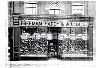Later takeovers included Pocock Bros. and Hall & Co. These acquisitions helped Freeman, Hardy & Willis expand to 460 shops on the eve of war in 1914. In the early years, the firm was advertised as ‘The Boot Kings’, ‘The Boot People’ or ‘The People’s Boot Providers’, but by 1900 it was claiming to be ‘The largest boot and shoe dealers in the world’.